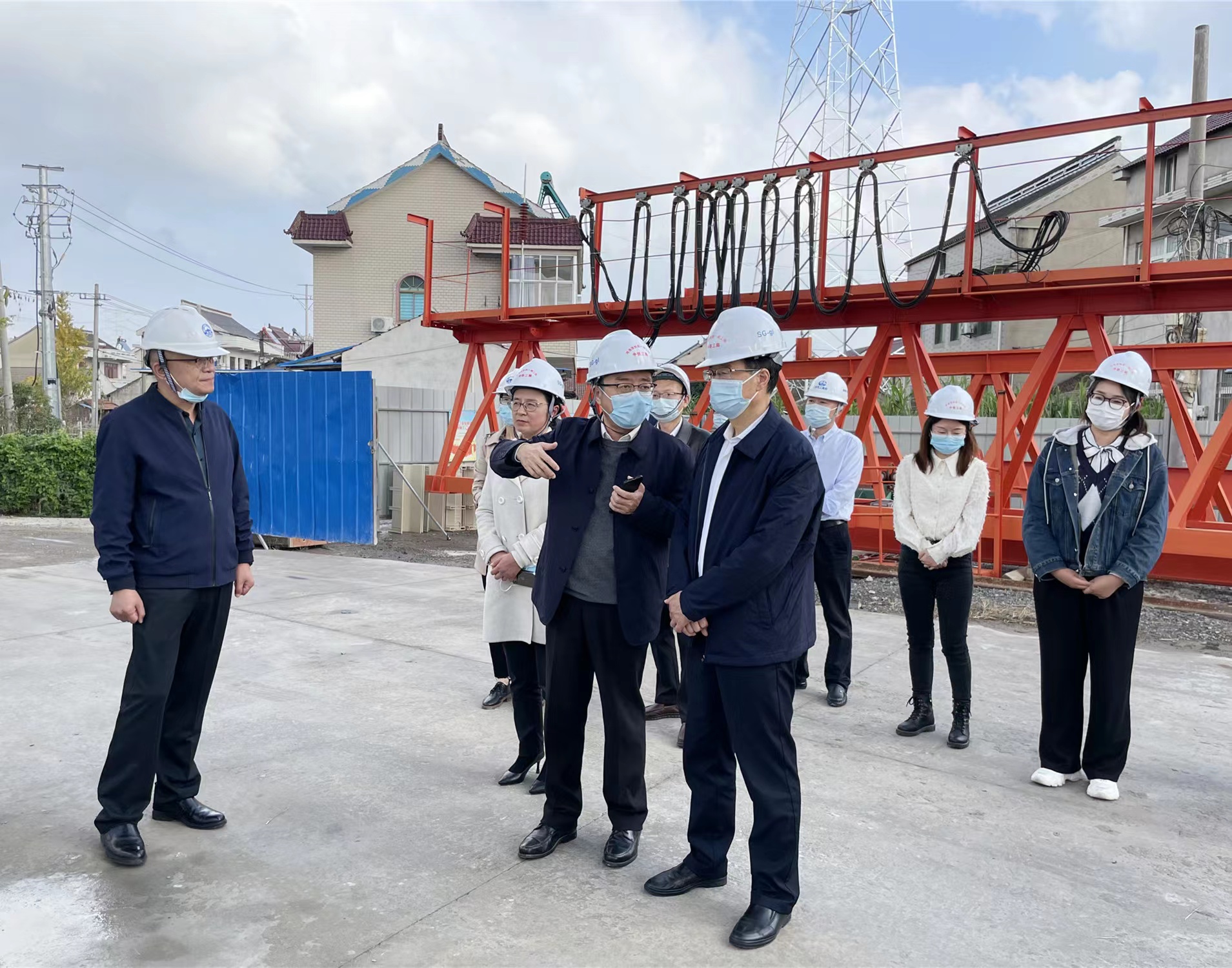 陳俊等一行實地察看了跨寧啟鐵路特大橋128米連續梁施工現場。南通港集團通海鐵路建設有限公司總經理鎮杰向調研組匯報了項目建設概況、區位優勢、發展定位、建設進展及下階段重點推進計劃等情況。