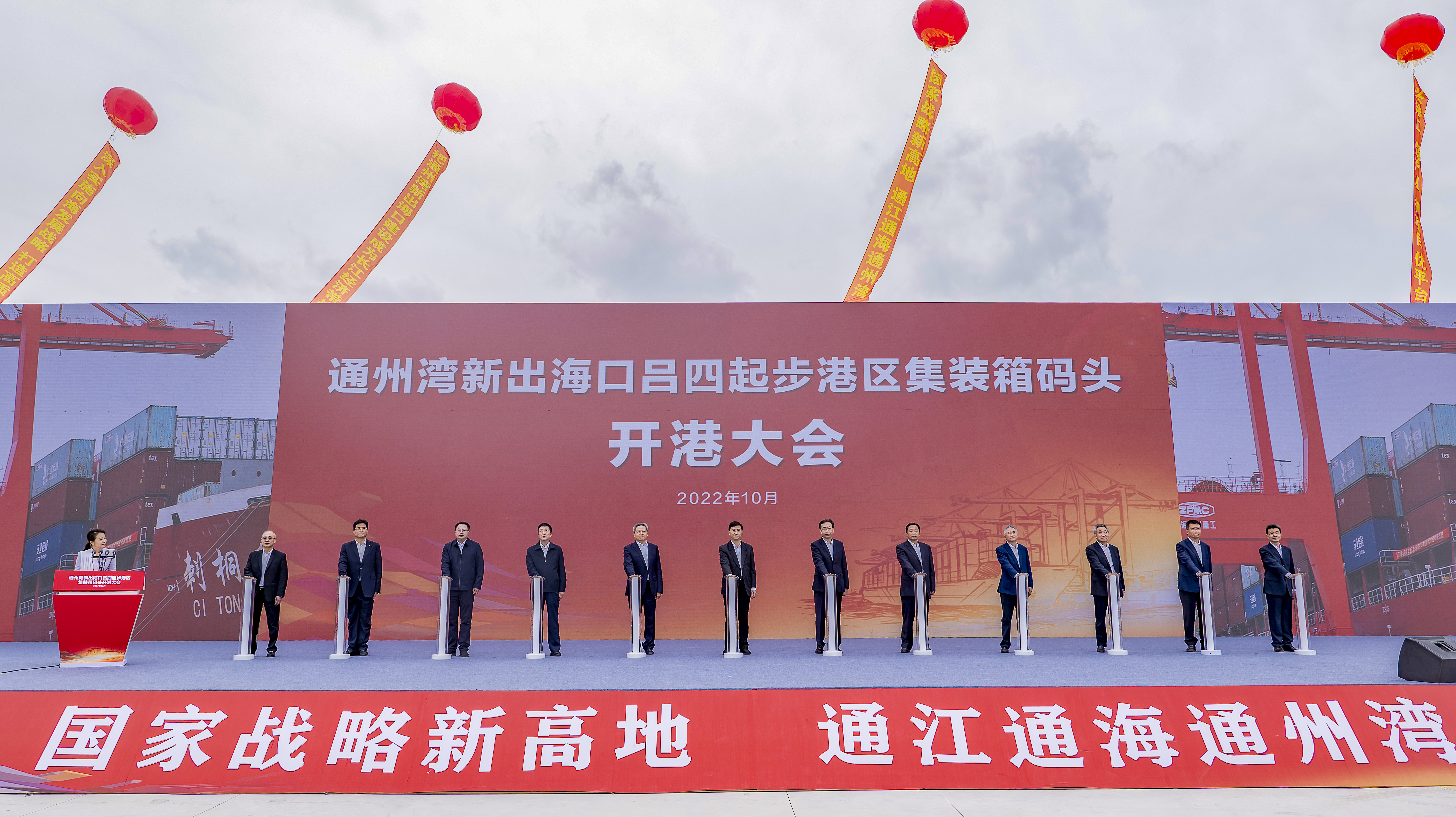 省政府副秘書長劉世虎,省交通運(yùn)輸廳一級巡視員丁軍華,江蘇海事局局長朱汝明,上港集團(tuán)董事長顧金山、總裁嚴(yán)俊,江蘇省港口集團(tuán)董事長陳明、總經(jīng)理關(guān)永健,上海市交通委港務(wù)監(jiān)管處處長李立民和南通市委書記、市人大常委會(huì)主任王暉,市委副書記、市長吳新明,市政協(xié)主席黃巍東,市人大常委會(huì)常務(wù)副主任、黨組副書記莊中秋等出席開港大會(huì)并共同啟動(dòng)按鈕、見證開港。市委副書記、市長吳新明主持開港大會(huì)。